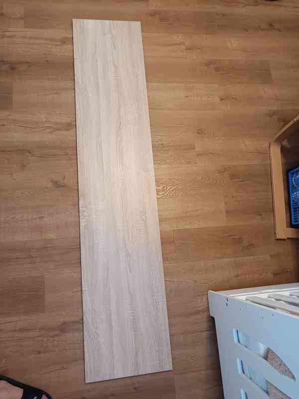 Prodám desku z dřevotřísky, dekor dub sonoma. Deska je zcela nepoužitá a nová (nedávno vyrobená). Rozměry: 200 cm x 43 cm. Důvod prodeje – koupili jsme nový nábytek. Výrobní cena 600,-Kč. Prodejní cena 350,-Kč. Osobní odběr: Luštěnice.